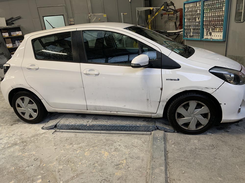 Choc latéral droit sur Yaris hybride, réparations avec mise en sécurité de la batterie.